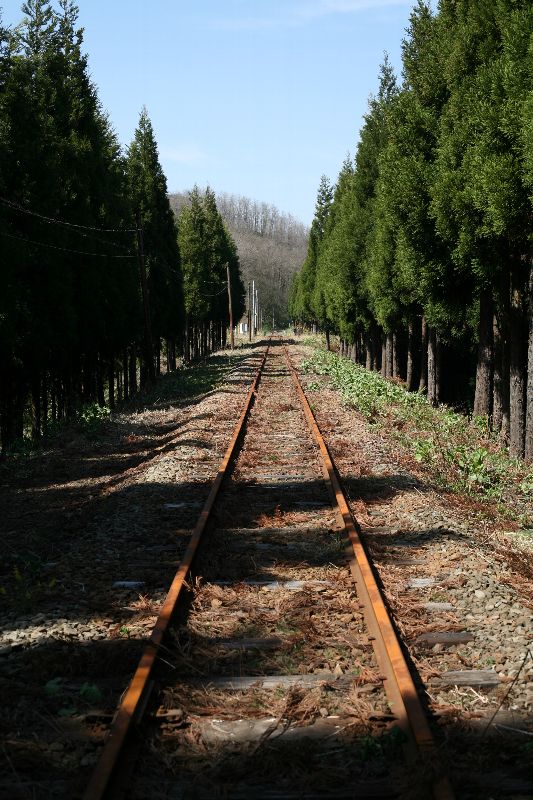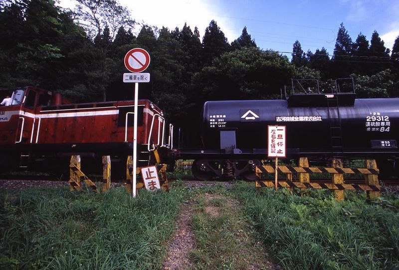 昨年(2008年)3月で鉄道輸送が休止された。 小坂の精錬所で複雑硫化鉱を製錬し、その副産物として精製される 濃硫酸を秋田港に向けて輸送していたものが、 たしか新炉を建設してリサイクル事業に特化したため、 硫酸輸送がなくなった・・・と記憶している。 定番撮影地だった一号隧道付近。 小坂駅を出たDD130形3重連が牽引する濃硫酸列車は 大きな唸りをあげ、黒煙を噴き上げながら左に180度方向を変え、 この杉木立の向こうから向かってきたものだった。 踏切は、こうまでしなくてはならないのだろうか。 一号隧道。 左のピラスター上部をアップしてみる。 木が生えている・・・。 いつも不思議に思うのだ。 隧道や橋梁の、わずかな隙間の土に種が根付き、 かなり大きな木となってしまっていることがある。 管理者は、それが小さなうちに枯らすことをしないのだろうか? 植物が伸びる力というのは、岩をも穿つことはよく知られている。 もしこの木が煉瓦の内側に根を張っていけば、 次第に煉瓦の構造物に悪い影響を与え、 ピラスターを破壊し、ということは地山からの圧力が坑門側に抜け、 坑門が倒壊してしまうことすらあるだろう。 かつての光景。 山一印のタキ29300。 ほかにもitochu、DOWAといったロゴが見られた。 昭和50年の航空写真。 http://w3land.mlit.go.jp/Air/photo400/75/cto-75-22/c1b/cto-75-22_c1b_59.jpg http://w3land.mlit.go.jp/Air/photo400/75/cto-75-22/c2b/cto-75-22_c2b_57.jpg