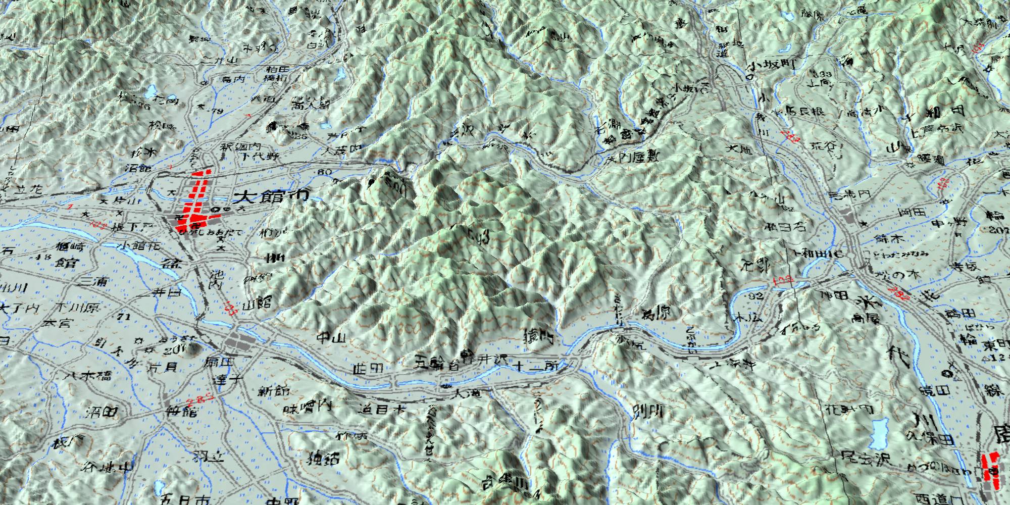 なぜ、小坂からわざわざ峠を越えて茂内に出てから大館に向かうのか? 現在の鉄道路線図を見ると、そのまま小坂川(米代川の支流)を下って 十和田南駅につなぐのが自然に見える。 十和田南駅から大館駅へは、やはり米代川沿いなので極端な勾配もない。 と思う。(あとで調べてみよう) 遠回りでも、勾配の少ないほうを選ぶのがセオリーである。 北海道の、函館から札幌を見よ。 鳥瞰図にすると、こうなる。 #カシミール3Dで作製。高度2万4000mより北を見る。レンズ50mm。 しかし、花輪線が、大館から毛馬内(現・十和田南)に延伸したのは大正4(1915)年。 小坂鉄道が大館まで通じたのは明治41(1908)年。しかも762mm。 現在から見れば、最初から1067mmで毛馬内に向けておいて ちょっと我慢すればよかったのに。と思う。 当時の大館~毛馬内を開通した秋田鉄道と、なにか因縁でもあったのだろうか? PR