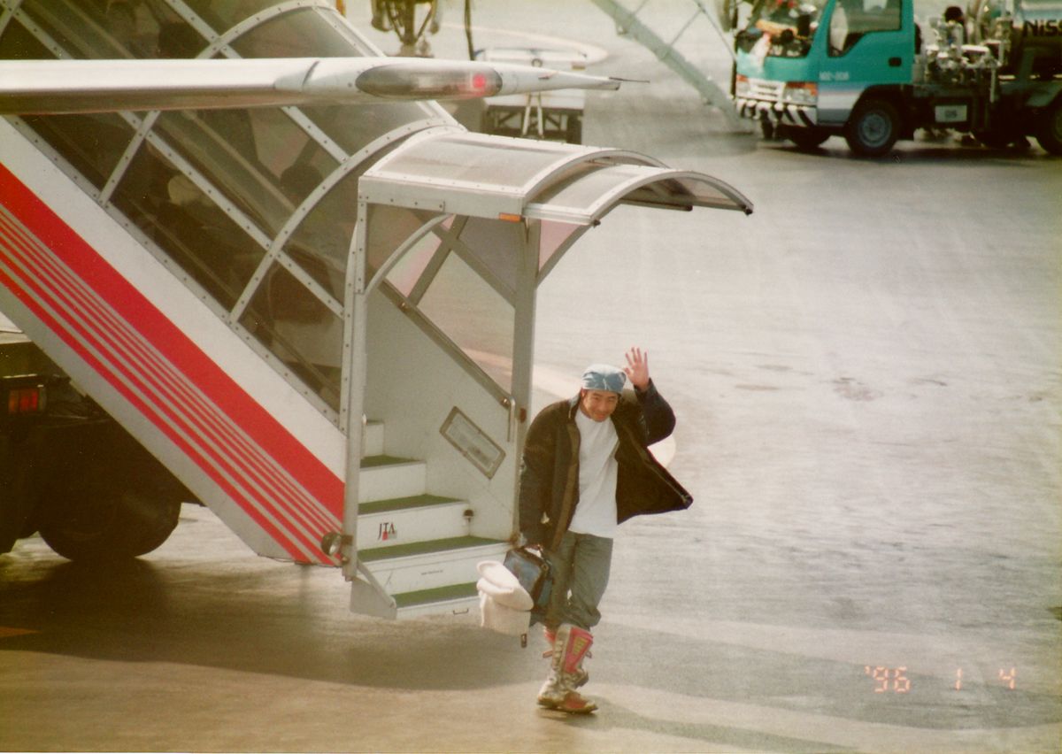 そして、ついに1月4日。こんな格好で飛行機に乗った。写真はZZ-R氏からいただいたもの。